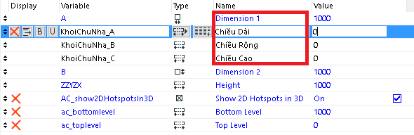 chúng ta sẽ thấy có 3 tham số sẵn có bao gồm KhoiChuNha_A, KhoiChuNha_B, KhoiChuNha_C đại diện cho 3 chiều của khối chữ nhật chúng ta vừa tạo (tương đương với X, Y và Z)